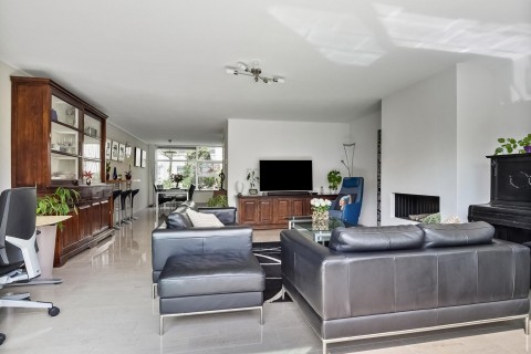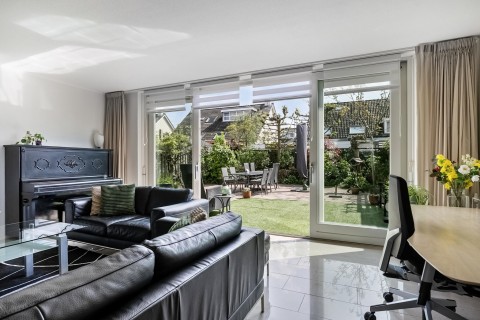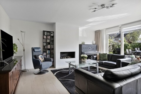 De L-vormige woonkamer (circa 47 m²) is modern en licht afgewerkt en voorzien van een sfeervolle open haard die zorgt voor extra warmte en gezelligheid. Dankzij de schuifpui aan de achterzijde stap je zo de zonnige tuin in.