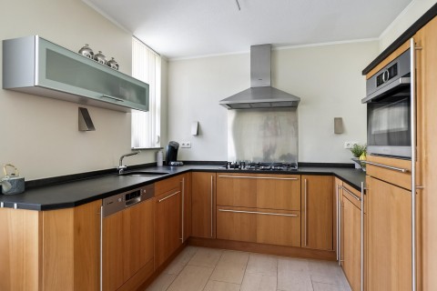 De keuken is gesitueerd aan de voorzijde en beschikt over een U-vormige opstelling met een stijlvol antraciet granieten werkblad en
