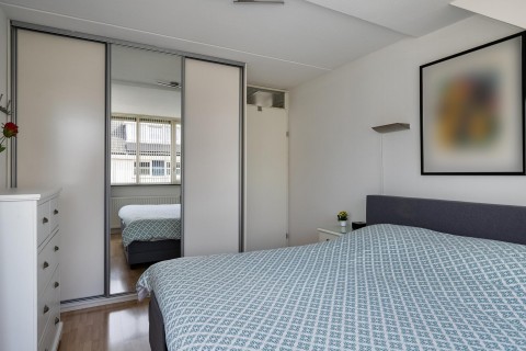 De ruime slaapkamer 1 aan de voorzijde is voorzien van een moderne dakkapel en een praktische ingebouwde kastenwand met