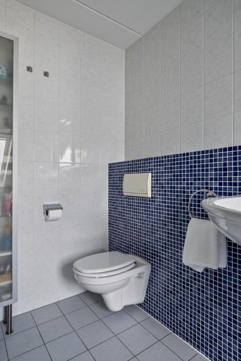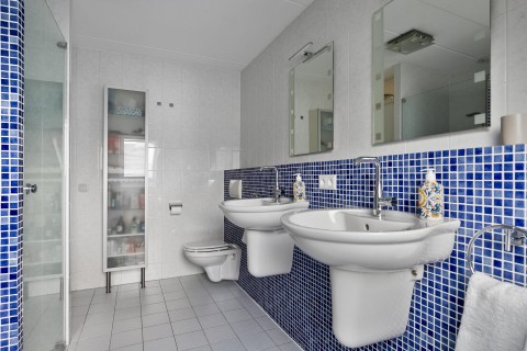De modern betegelde badkamer is ruim opgezet en uitgerust met een ligbad, separate douche, twee wastafels, tweede toilet en