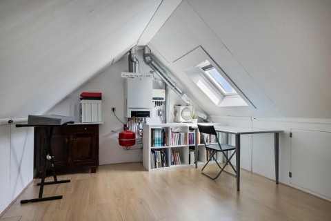 Accessible via loft ladder, this spacious, practical attic includes a large Velux skylight, laminate flooring, central heating boiler, mechanical ventilation unit, and storage space behind the knee walls.