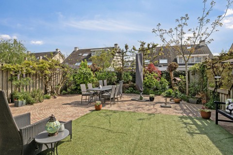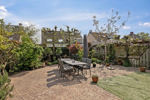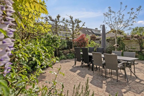 De zonnige achtertuin is bijzonder sfeervol dankzij de fraai aangelegde borders met diverse beplanting. Een mooie mix van bloemen,